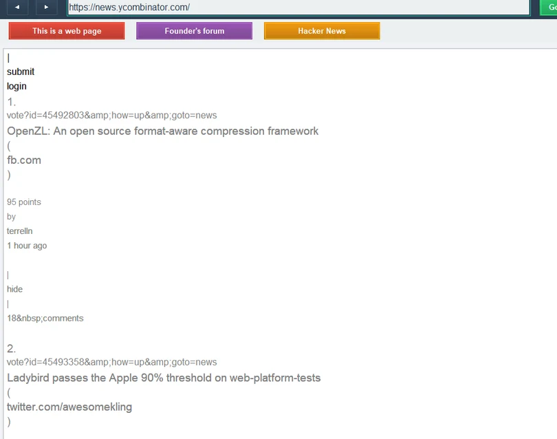- It relies on an external library for web requests and is very far from being a full-featured browser. It can't render Hacker News yet.