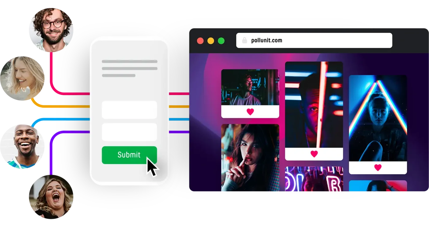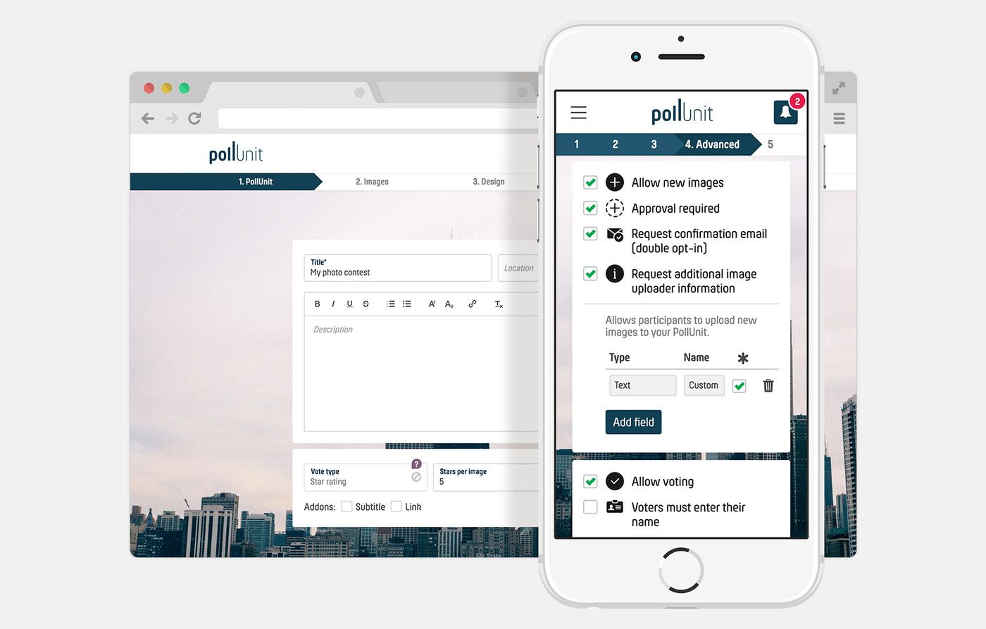 PollUnit offers you different possibilities to request any information. The caption, which can optionally be hidden, is a standard field. You can also request a subtitle and link. This information is visible for all participants in the photo contest and can be activated in the first step when creating the contest.