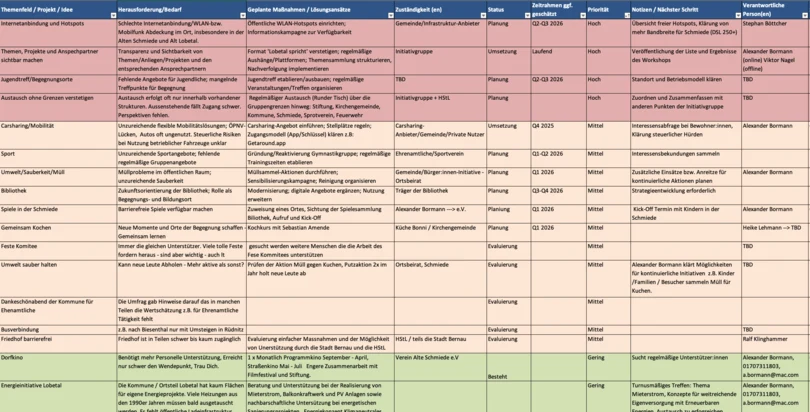 Unten seht Ihr die vorläufige Übersicht der Ideen, Anliegen und Projekte. Fehlende Ideen und Verantwortlichkeiten können in der Interaktiven Übersicht der Ideen und Anliegen oder in der hier verlinkten Excel-Tabelle ergänzt werden.
